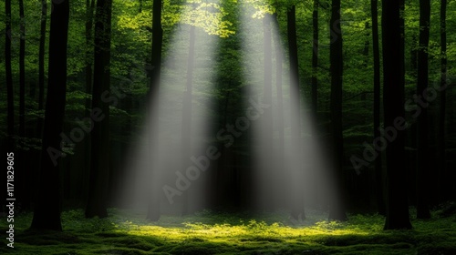 Fototapeta premium A serene forest scene illuminated by beams of light filtering through the...