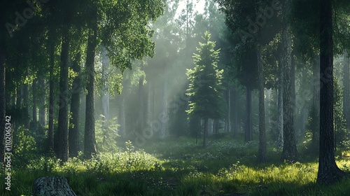 Obraz premium A serene forest scene illuminated by soft light, showcasing nature's...