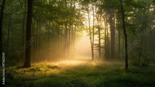 © BerkahStock, Fototapeta premium A serene forest scene illuminated by soft sunlight filtering through the trees.