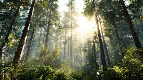 Obraz premium A serene forest scene illuminated by sunlight filtering through tall trees,...