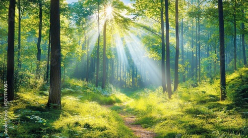 © Asayamrad, Fototapeta premium A serene forest scene illuminated by sunlight filtering through trees, casting vibrant rays on a lush, green path.