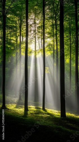 Obraz premium A serene forest scene illuminated by sunlight streaming through tall trees,...
