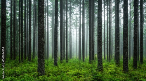 © Nitchalee N., Fototapeta premium A serene forest scene shrouded in mist, featuring tall trees with textured bark and lush green undergrowth, creating a tranquil atmosphere.