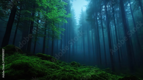 Fototapeta premium A serene forest scene shrouded in mist, showcasing lush green foliage and towering trees, creating a mystical atmosphere.