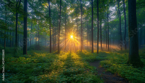 Naklejka premium A serene forest scene where sunlight beams through tall trees, creating a magical atmosphere. The mist and vibrant foliage enhance the tranquil setting.
