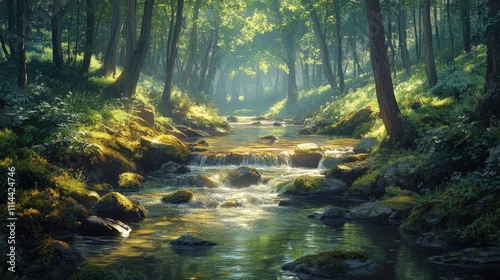 © KAMOSTOCK, Obraz premium A serene forest scene with a clear stream flowing through lush greenery, sunlight filtering through the trees, creating a tranquil, natural atmosphere.