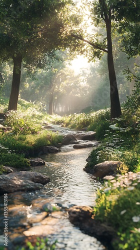 © Mrsabata, Obraz premium A serene forest scene with a gentle stream, dappled sunlight, and lush greenery.