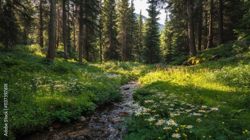 © Pixel, Fototapeta premium A serene forest scene with a stream and blooming wildflowers.