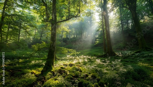 © Madyson, Obraz premium A Serene Forest Scene With Lush Greenery And Soft Light Filtering Through The Trees