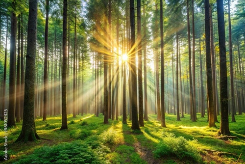 © methinee, Obraz premium A serene forest scene with morning sunlight filtering through the trees
