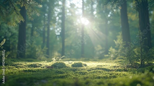 Obraz premium A serene forest scene with sunlight filtering through lush green trees,...