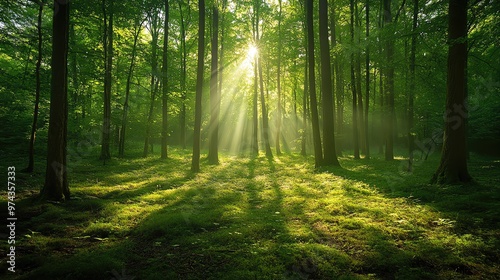 © UnderTheSun, Fototapeta premium A serene forest scene with sunlight filtering through tall trees, casting gentle rays on the lush green foliage below.