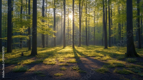 Fototapeta premium A serene forest scene with sunlight filtering through tall trees, casting...
