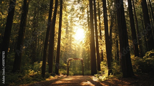 Obraz premium A serene forest scene with sunlight filtering through tall trees, featuring a wedding arch.
