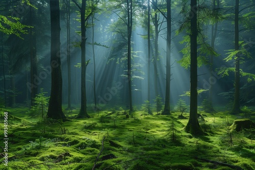 Obraz premium A serene forest scene with sunlight filtering through the trees