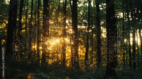 © BerkahStock, Obraz premium A serene forest scene with sunlight filtering through trees and ethereal text elements.