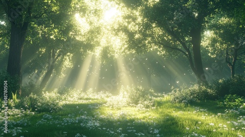 Obraz premium A serene forest scene with sunlight filtering through trees, creating a...