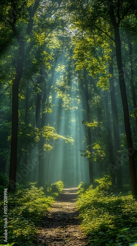 Fototapeta premium A serene forest scene with sunlight filtering through trees, creating a...