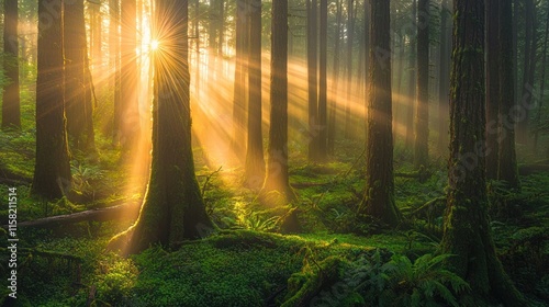 Fototapeta premium A serene forest scene with sunlight filtering through trees, creating a...