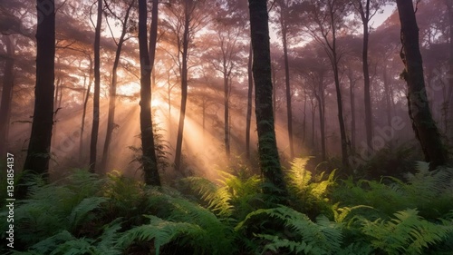 Fototapeta premium A serene forest scene with sunlight filtering through trees, illuminating ferns in a misty atmosphere.