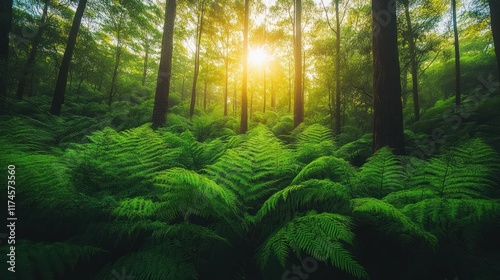 © Yuni, Obraz premium A serene forest scene with sunlight filtering through trees, illuminating lush green ferns.