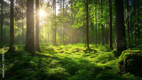 Obraz premium A serene forest scene with sunlight filtering through trees, illuminating...