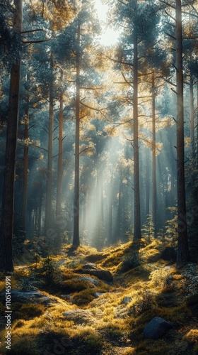 Naklejka premium A serene forest scene with sunlight penetrating through trees, highlighting...