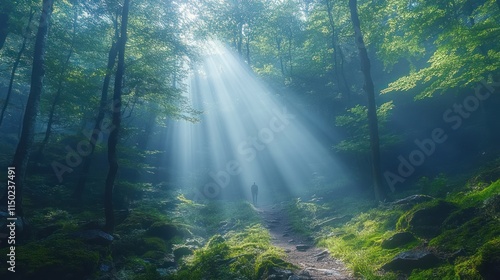 Fototapeta premium A serene forest scene with sunlight streaming through trees, creating a...