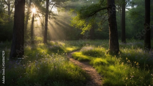 Fototapeta premium A serene forest scene with sunlight streaming through trees, illuminating a...