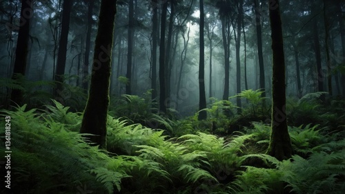 Obraz premium A serene forest scene with tall trees and lush ferns, illuminated by soft,...