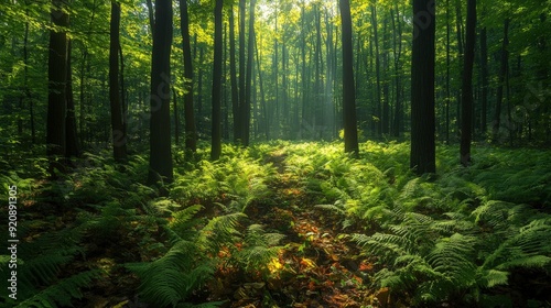 Obraz premium A serene forest scene with tall trees and lush ferns illuminated by soft...