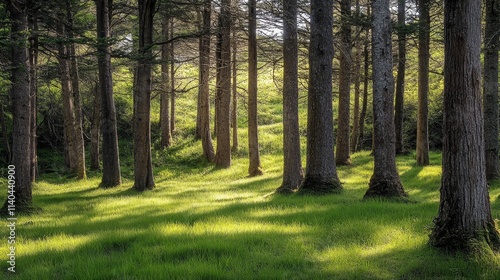 Obraz premium A serene forest scene with tall trees and lush green grass illuminated by...