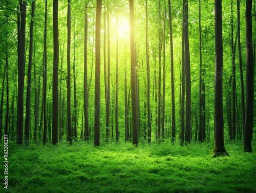 © Morninghead, Fototapeta premium A serene forest scene with tall trees and lush greenery, illuminated by soft sunlight filtering through the leaves, creating a tranquil and peaceful atmosphere.