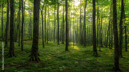 Fototapeta premium A serene forest scene with tall trees bathed in soft sunlight, highlighting...