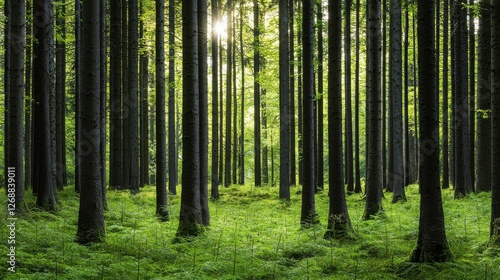© Alohanongza, Fototapeta premium A serene forest scene with tall trees, lush greenery, and sunlight filtering through the leaves, creating a peaceful natural atmosphere.