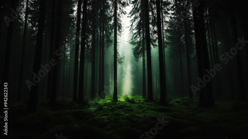 © lertsakwiman, Obraz premium A serene forest scene with towering trees and soft light filtering through the mist, creating a peaceful atmosphere.