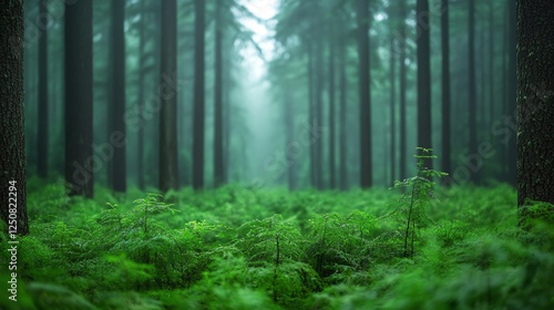 © Chanagun, Fototapeta premium A serene forest scene with towering trees surrounded by lush green ferns