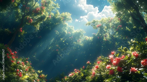 Naklejka premium A serene forest scene with vibrant flowers and rays of sunlight filtering...