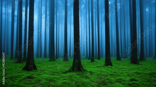 Naklejka premium A serene forest shrouded in mist, with tall trees and lush green undergrowth,...