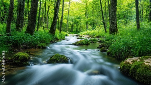 Obraz premium A serene forest stream flows through lush greenery, creating a peaceful...