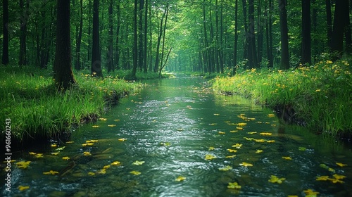 Obraz premium A serene forest stream surrounded by lush greenery and blooming yellow...