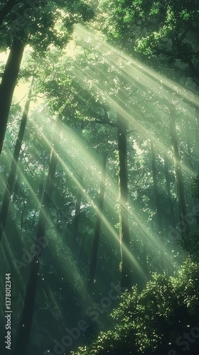 © neirfy, Fototapeta premium A Serene Forest teeming with Life, where Sunlight Beams Filter Gently Through Lush Green Trees all around