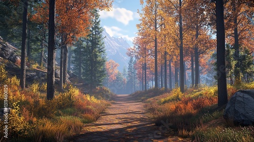 © shameem, Fototapeta premium A serene forest trail with tall trees on either side