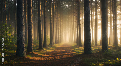 Obraz premium A serene forest trail with towering pine trees soft morning mist