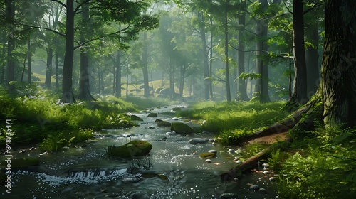 © Hassan, Obraz premium A serene forest with a stream flowing through it