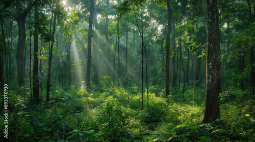 © Chatchanan, Obraz premium A serene forest with agarwood trees, sunlight filtering through the leaves
