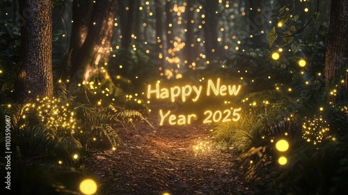 Naklejka premium A serene forest with fireflies spelling "Happy New Year 2025" in their...