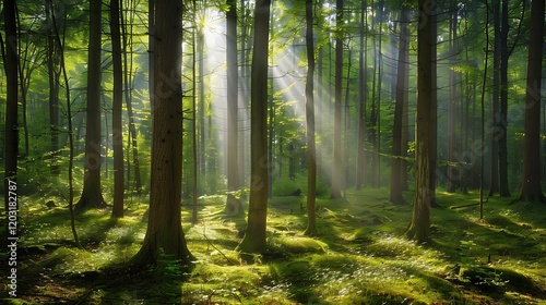 Obraz premium A serene forest with sunlight filtering through the trees, symbolizing peace...
