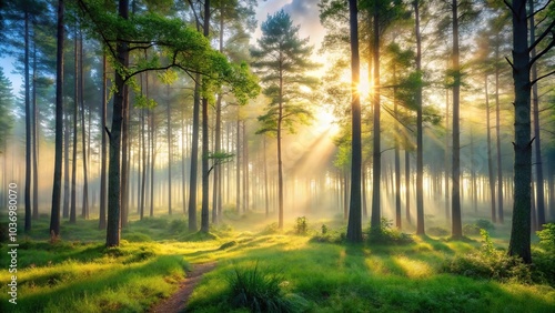 Naklejka premium A serene forest with tall trees and a misty atmosphere at dawn, calm,...
