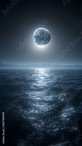 Fototapeta premium A serene full moon casts its ethereal glow upon a tranquil, dark ocean